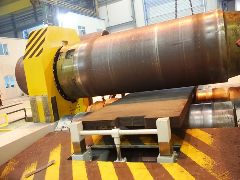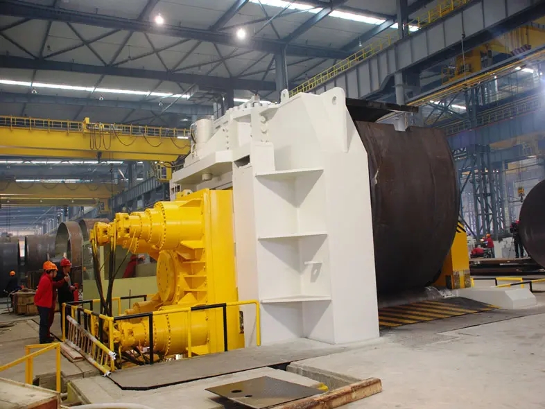 液压全驱动水平下调式三辊卷板机,釆用右主油缸釆用上置,左主油紅下置式结构。该机三个工作棍均为主驱动辊,上辊由液压马达通过行星减速 机减速带动回转,下辊由液压马达通过行星减速机减速带动回转,行星驱动装置与卷辗轴直接耦合,可以大幅度减少负载损失(无用功),使尽可能 大的功(有用功)用于卷板;上掘的升降采用液压传动,升降位移由计算机控制,自动调平,屏幕显示,同步精度±0.2mm。下辊水平移动采用机械 传动,水平移动通过蜗轮减速机减速,经螺杆、螺母副转换为直线运动带动。翻倒架的倾倒和复位采用液压传动上的尾部装有液压平衡机构,可以方便卸出卷制后的工件及筒体。设有固定式操作台和遥控按钮盒各一个,方便工人使用。设有安全联锁装置,使操作更加安全。该机操作简单、维 修方便,卷制精度高,是一种先进实用的大型卷板设备。