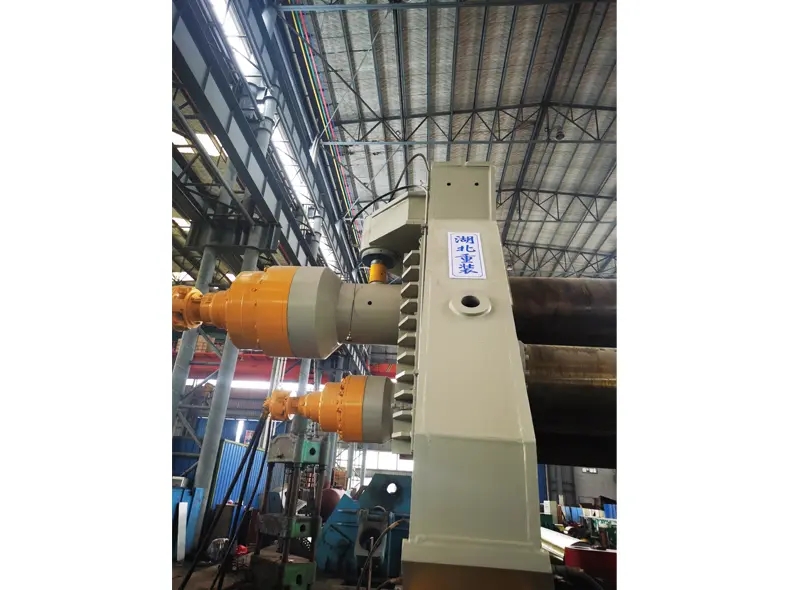 4.四辊卷板机使用前辊预弯曲钢板的另一端。预弯曲左端后,将后滚轮降低到原始位置,并启动上滚轮。当钢板遵循上述弯曲位置时,上辊停止旋转。操作前,滚子抬起预弯曲钢板的另一端,然后左右调整两个滚子电路的压力。