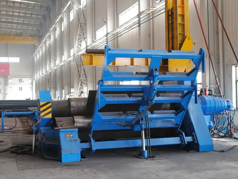 6. 四辊卷板机成型和弯曲:取出工件:弯曲完成后,将底部辊降低到较低位置,然后将工件降低到一定位置,两侧有辊子,翻转,提起与顶部辊平行的工件,取出工件,完成工作周期。