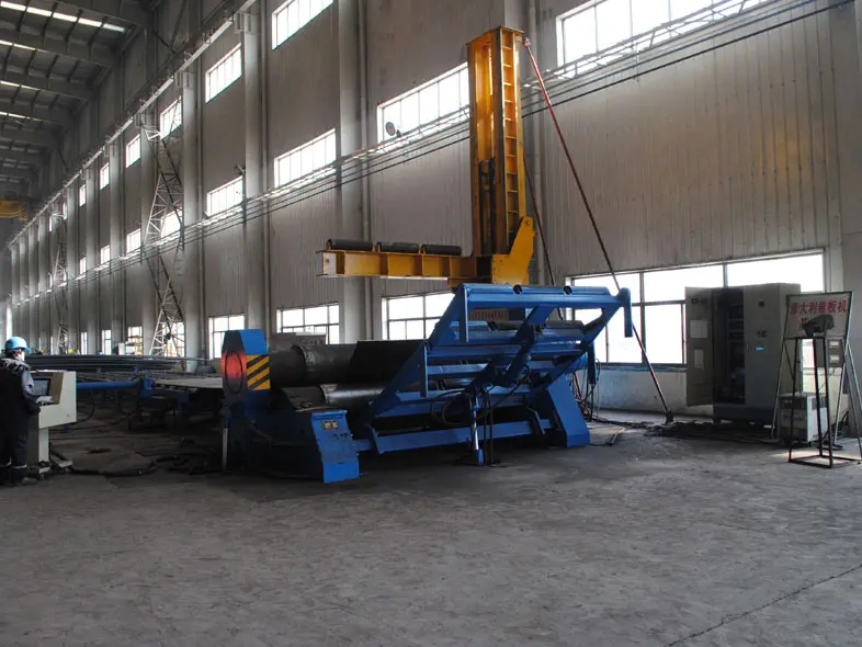 1.四辊卷板机操作下辊上升,使母线略大于上辊下的工作厚度,然后操作进料侧辊,使上母线在同一水平上,然后在上辊和下辊之间操作另一侧。