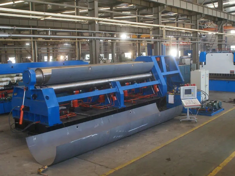 机器的上辊可以垂直和水平移动。垂直提升是液压传动。液压缸中的液压油作用在活塞杆上,以获得水平运动。扭矩通过涡轮杆箱、涡轮滚轴和螺杆机构传递,以驱动上辊。滚筒的水平运动,下辊只旋转为液压折弯机提供扭矩,下辊配备了可调节的怠速滚筒,上辊呈滚筒形状,这提高了产品的直线度。它适用于各种横截面形状的拖车的油罐的滚动。EZHONG是中国领先的液压卷板机制造商之一,我们以合理的价格出售高品质的液压机。